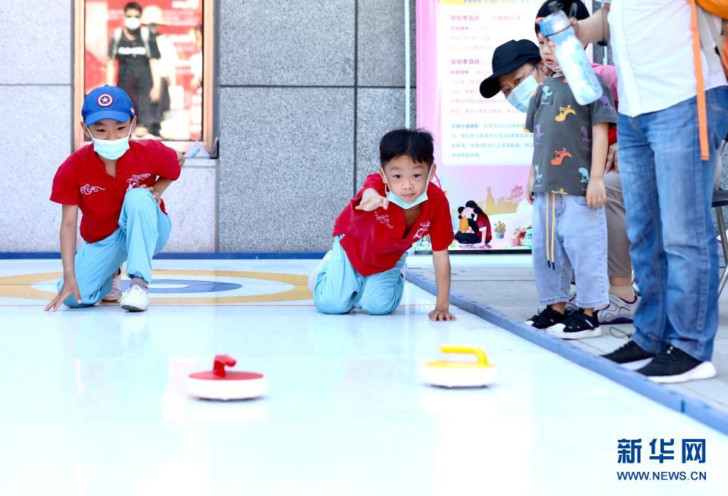 5月29日,小朋友在中国儿童中心的活动上体验旱地冰壶。