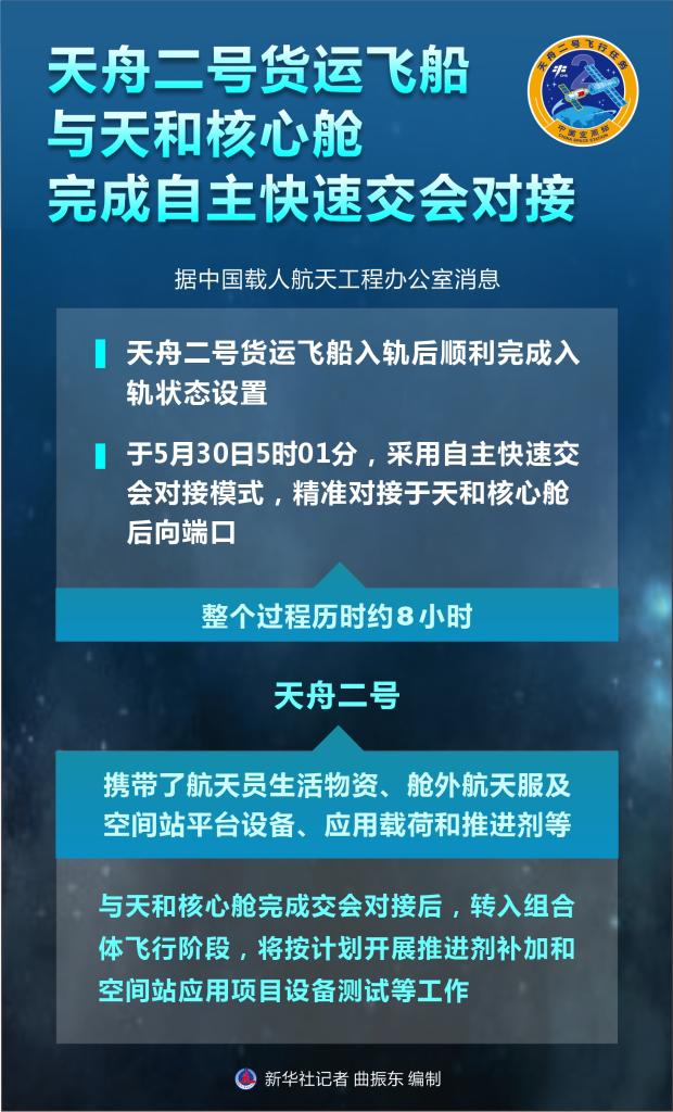 新华社海南文昌5月30日电(记者黎云、张汨汨)据中国载人航天工程办公室消息,天舟二号货运飞船入轨后顺利完成入轨状态设置,于5月30日5时01分,采用自主快速交会对接模式,精准对接于天和核心舱后向端口,整个过程历时约8小时。