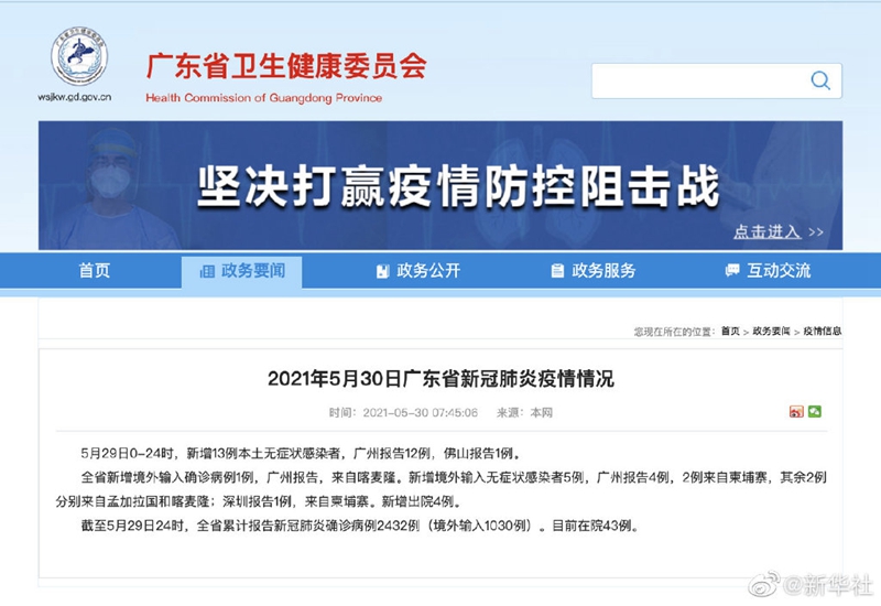 5月29日0-24时,新增13例本土无症状感染者,广州报告12例,佛山报告1例。