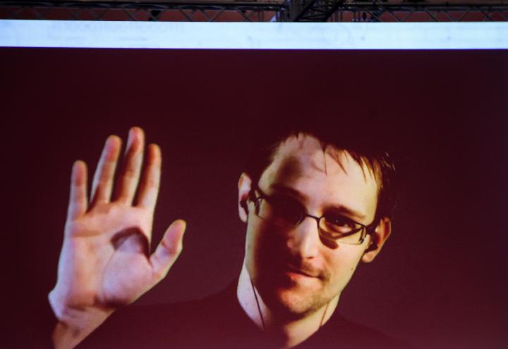 2015年3月18日,在德国汉诺威,大屏幕上显示斯诺登接受采访的画面。(新华社记者张帆摄)