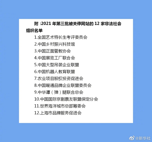 记者31日从民政部获悉,民政部会同中央网信办等部门依法关停了2021年第三批12家非法社会组织网站及其新媒体账号,清除了有关关联网页。此次的关停涉及全国艺术特长生考评委员会、中国乡村振兴科技馆、中国正面管教协会、中国机器人教育联盟等12家已被取缔的非法社会组织。