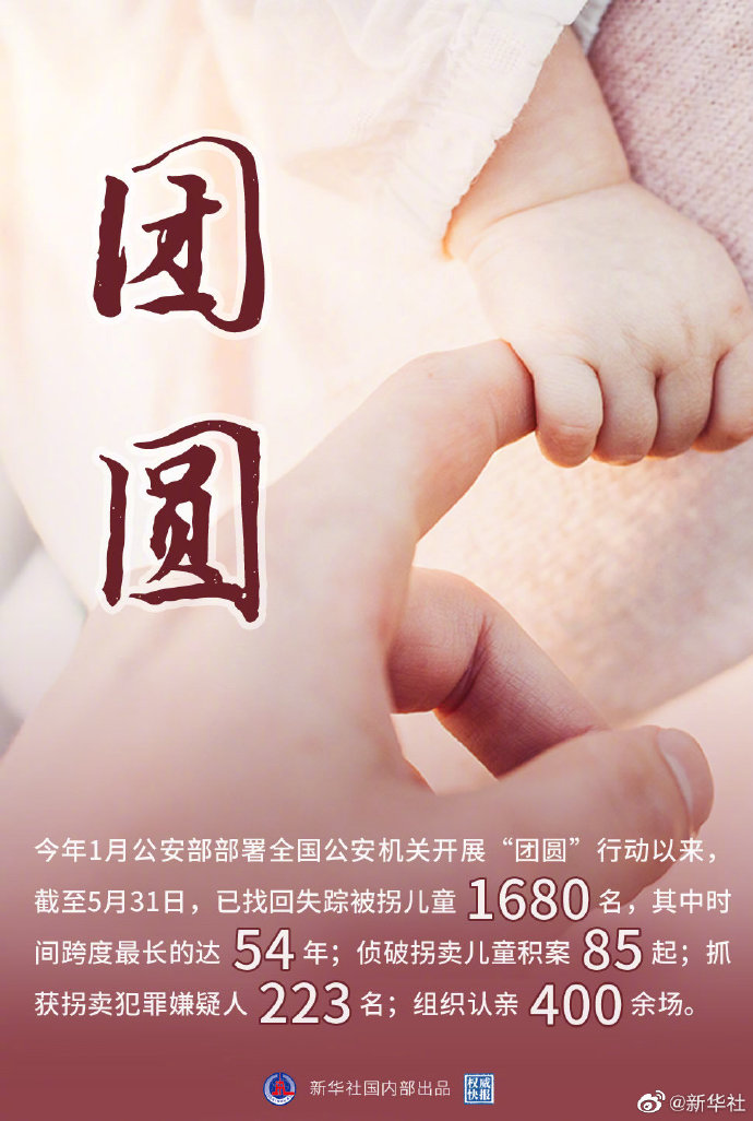 记者从1日召开的公安部新闻发布会获悉,今年1月公安部部署全国公安机关开展“团圆”行动以来,已找回失踪被拐儿童1680名,其中时间跨度最长的达54年;侦破拐卖儿童积案85起;抓获拐卖犯罪嫌疑人223名;组织认亲400余场。孩子,天涯海角也要找到你!(记者白阳、熊丰,海报设计贾伊宁)