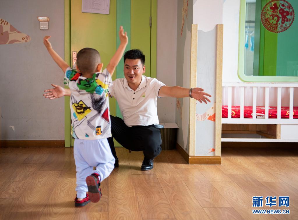 在太原市社会(儿童)福利院,一名小朋友跑向党龙祥(5月31日摄)。新华社记者 杨晨光 摄