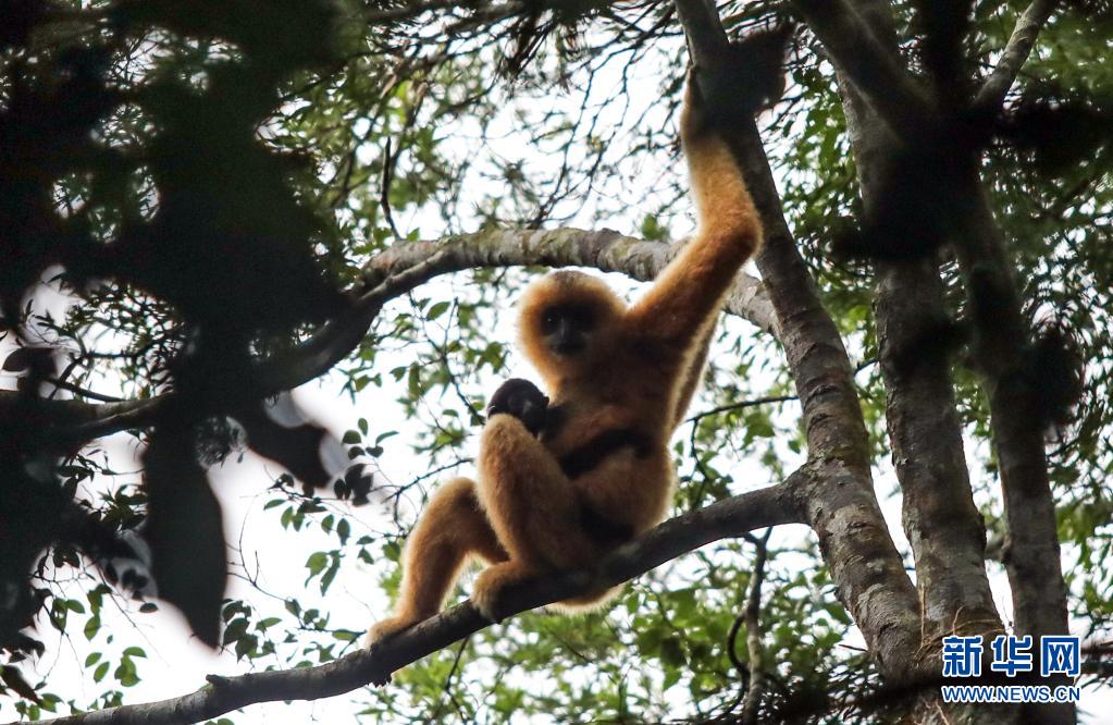 这是在海南霸王岭热带雨林里拍摄的一只带着幼崽的雌性海南长臂猿(2019年10月25日摄)。新华社记者 蒲晓旭 摄