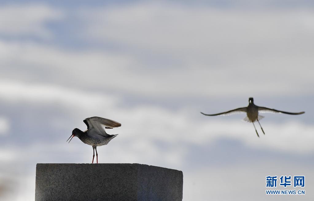 初夏,红脚鹬在位于西藏拉萨的拉鲁湿地国家级自然保护区内起舞觅食。