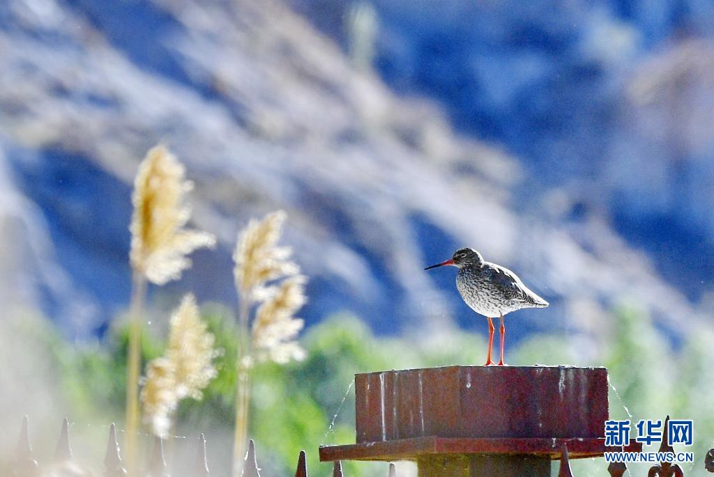 初夏,红脚鹬在位于西藏拉萨的拉鲁湿地国家级自然保护区内起舞觅食。