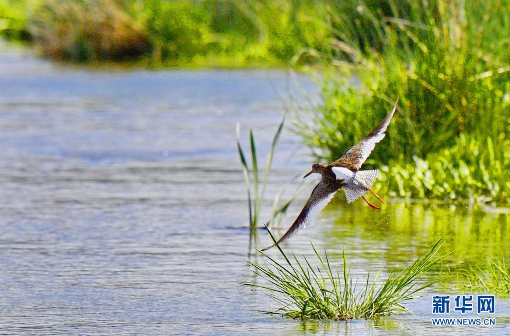 红脚鹬在拉鲁湿地上起舞(6月2日摄)。