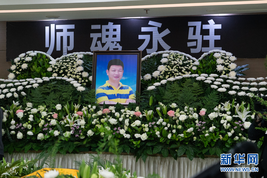 6月3日晚,因勇救两名落水儿童而献出年轻生命的重庆英雄教师王红旭追悼会在大渡口区宝山堂殡仪馆举行,图为追悼会现场。新华网 耿骏宇 摄