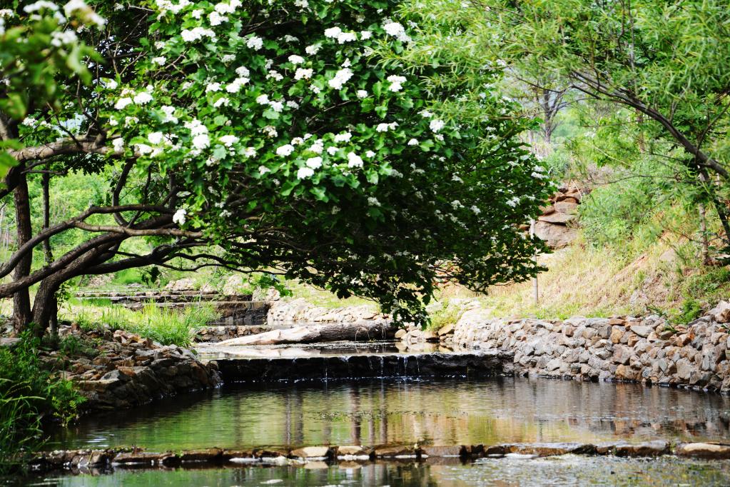 记者走进村里的“溪谷小镇”。绿树掩映之中,传统又兼具胶东特色的房屋若隐若现。小桥流水,繁花远山,令人流连忘返。
