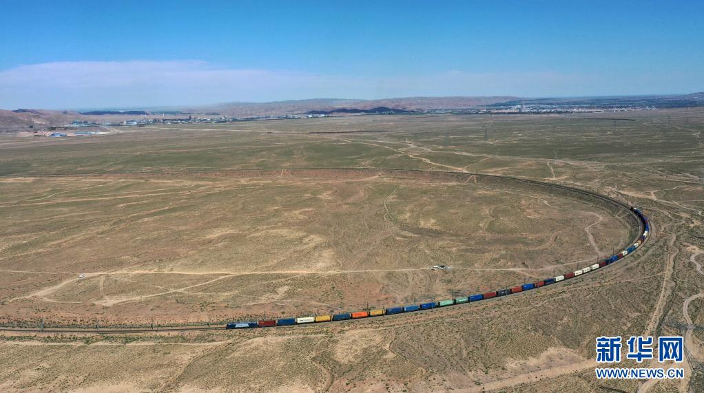 6月4日,一列火车驶过恢复通行的兰新铁路事发路段(无人机照片)。新华社记者 陈斌 摄
