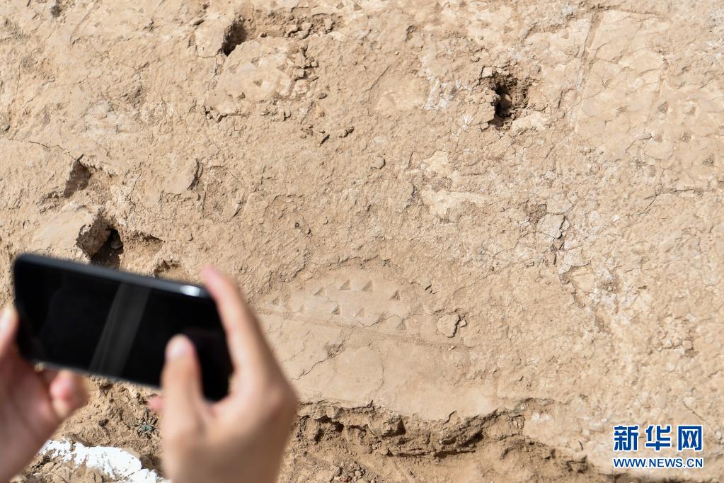 在陶寺遗址宫城内的大型夯土建筑基址上,考古工作者在拍摄房址“装修”的痕迹(6月3日摄)。新华社记者 曹阳 摄
