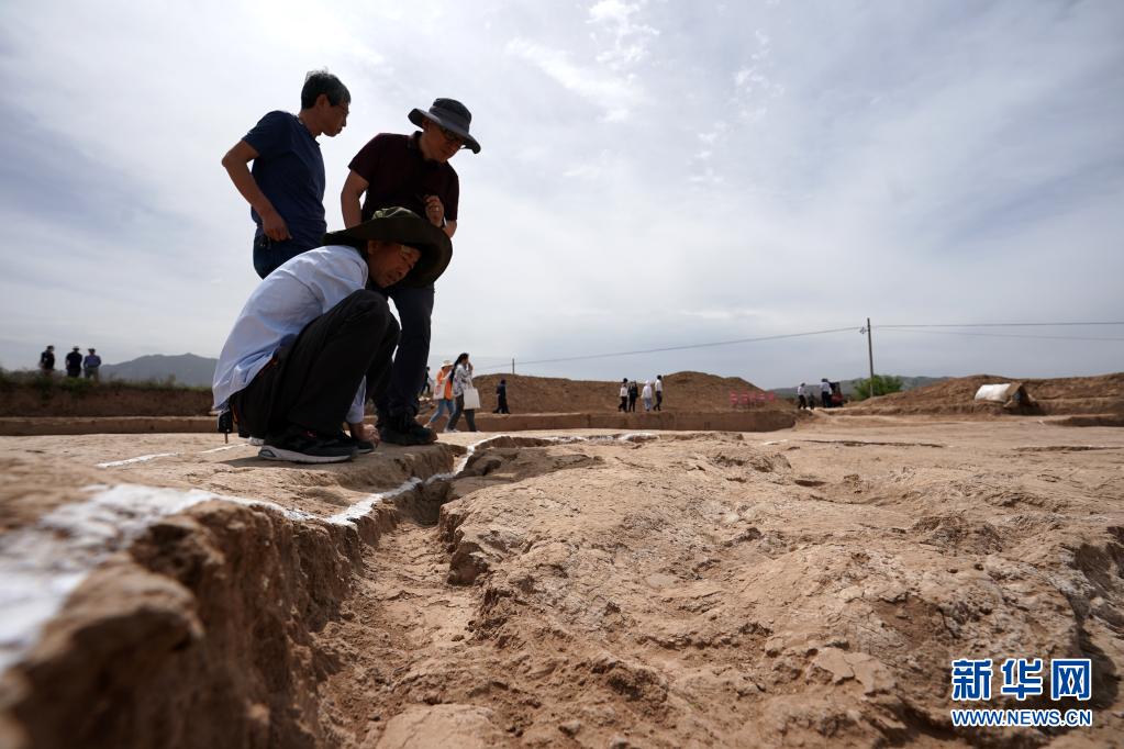在陶寺遗址宫城内的大型夯土建筑基址上,考古工作者在查看房址“装修”的痕迹(6月3日摄)。新华社记者 詹彦 摄