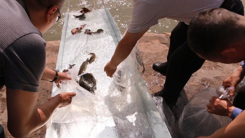 工作人员使用滑道将鱼放归长江。 新华社发(刘晓鹏 摄)