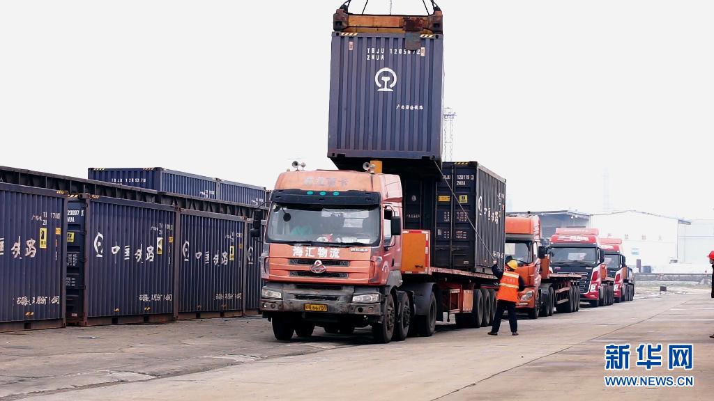 在广西钦州港码头,车队在运输中欧班列集装箱(5月10日摄)。新华社记者 张爱林 摄