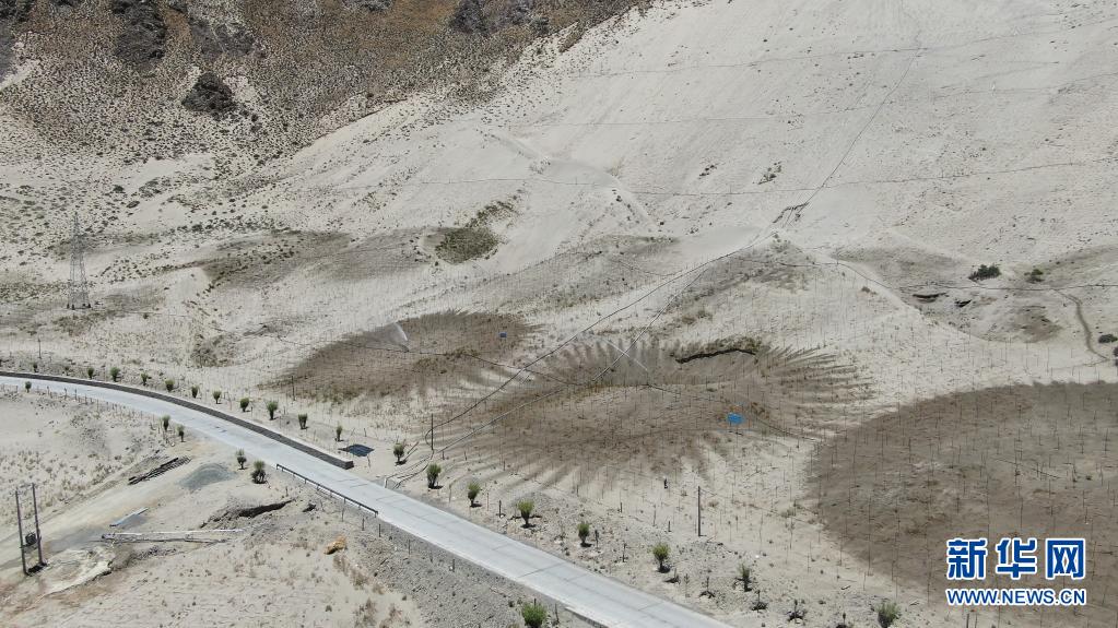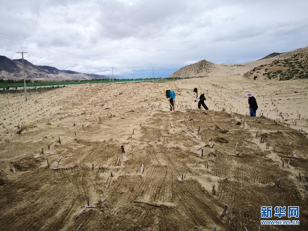 在山南市雅鲁藏布江河谷地带,村民们在维护固沙用的草方格(2019年7月14日摄)。新华社发(资料照片)
