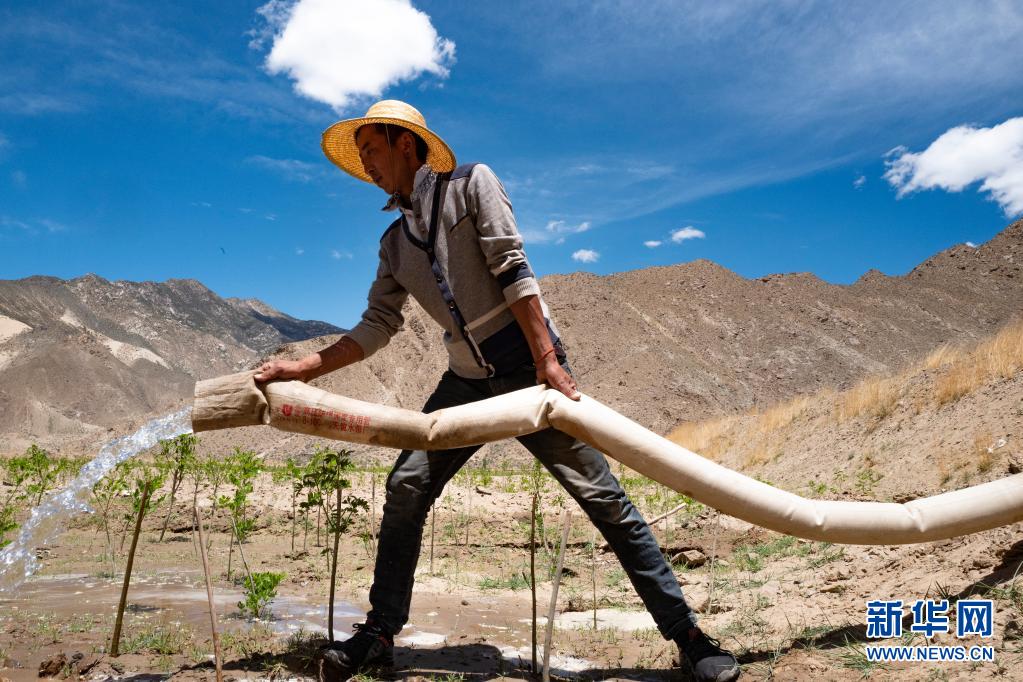山南市贡嘎县吉雄镇刘琼村村民正在为树苗浇水(6月2日摄)。新华社记者 普布扎西 摄