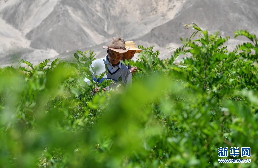 山南市贡嘎县吉雄镇刘琼村村民在检查树苗生长情况(6月2日摄)。新华社记者 晋美多吉 摄