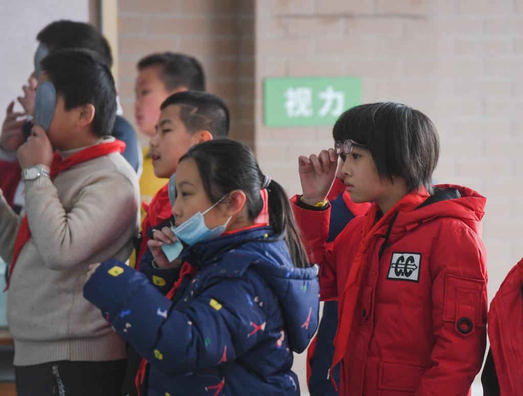 2021年1月11日,在福建省福州市铜盘中心小学,一名近视的学生在等待时摘下眼镜努力分辨视力表。新华社记者 宋为伟 摄