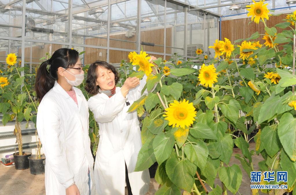 6月3日,三瑞农科向日葵技术研究院科研人员在观察向日葵抗病害情况。新华社记者 李云平 摄