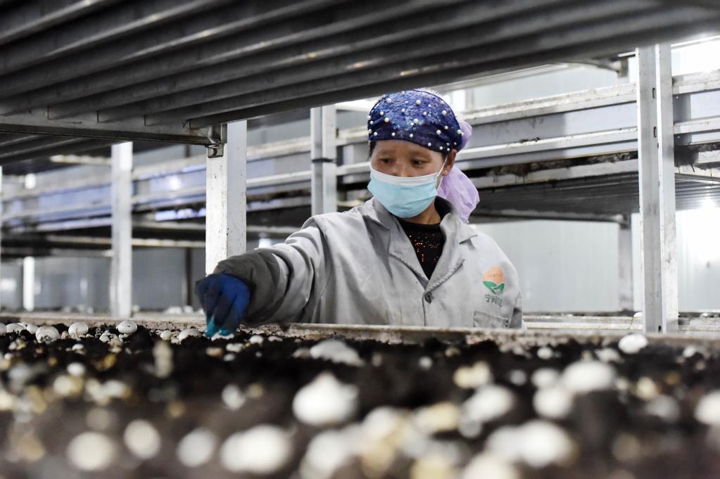 农民在宁夏银川市永宁县闽宁镇双孢菇栽培示范基地采摘蘑菇。新华社记者唐如峰摄