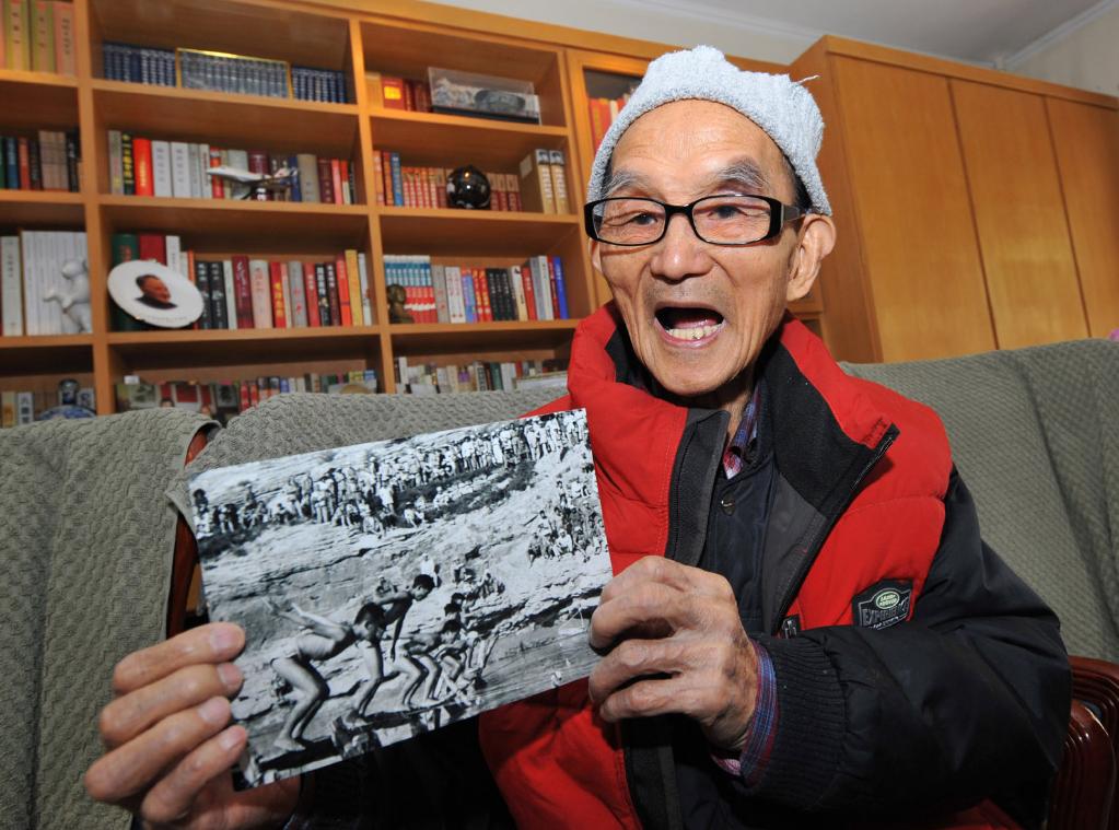2008年4月3日,徐肖冰老人向记者介绍他1943年在延安清凉山下拍摄的游泳比赛的照片。新华社记者何俊昌摄