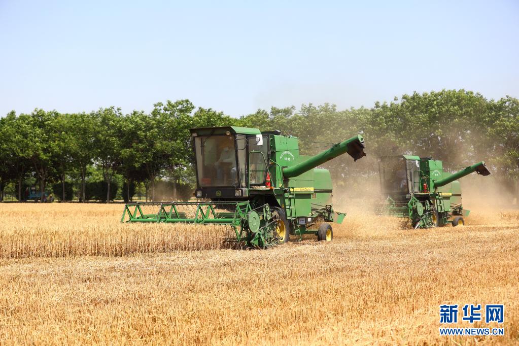 6月6日,联合收割机在安徽省淮北市濉溪县五铺农场的麦田里作业。