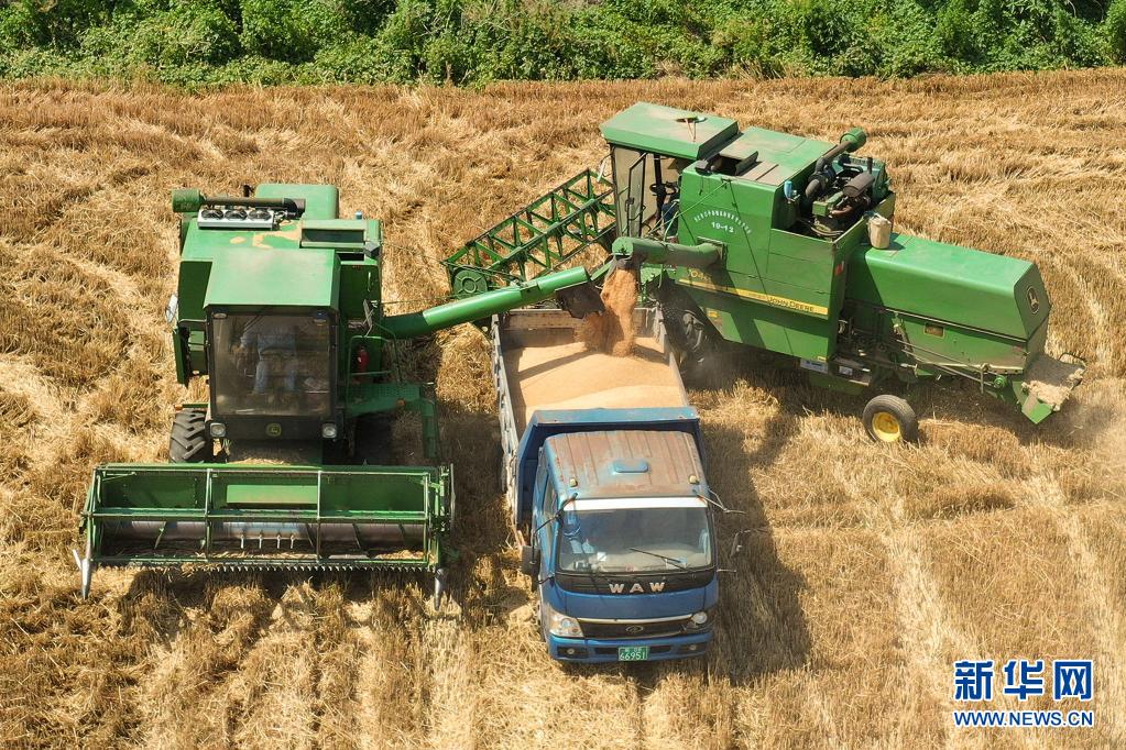 6月6日,在安徽省淮北市濉溪县五铺农场的麦田里,农机手操作收割机将收获的小麦装车(无人机照片)。