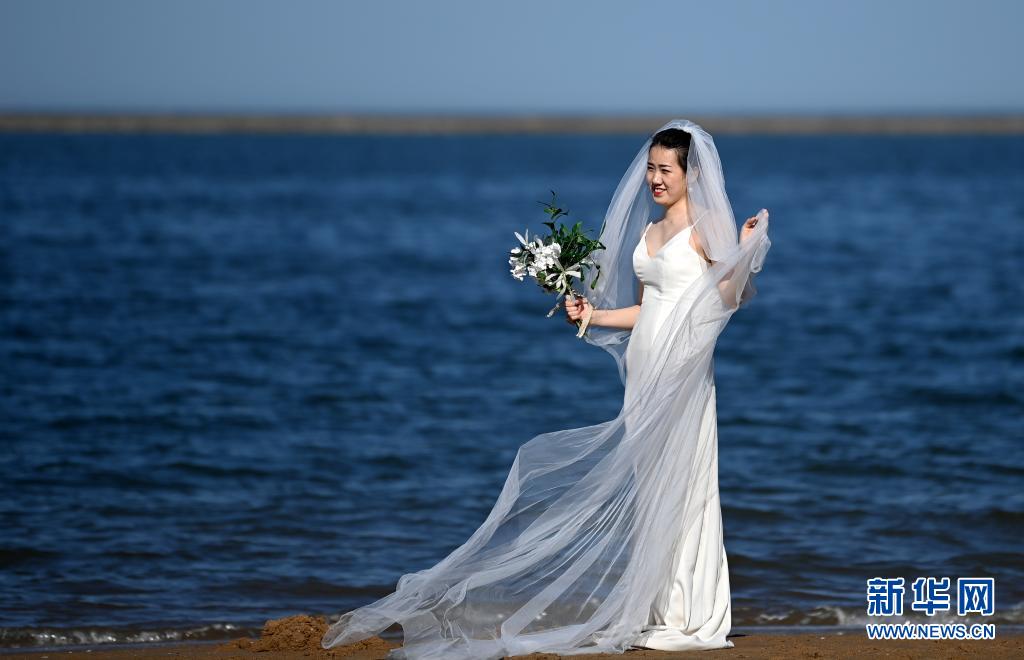 新人在天津市滨海新区东疆港人工沙滩拍摄婚纱照(6月5日摄)。新华社记者 李然 摄