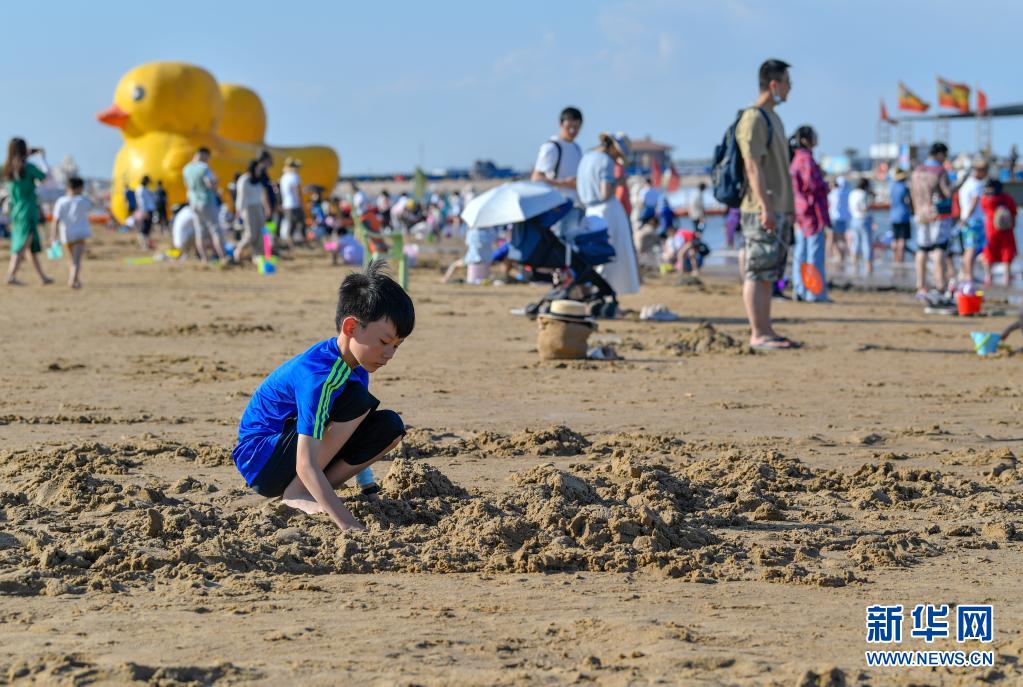 小朋友在天津市滨海新区东疆港人工沙滩上玩耍(6月5日摄)。新华社发(孙凡越摄)