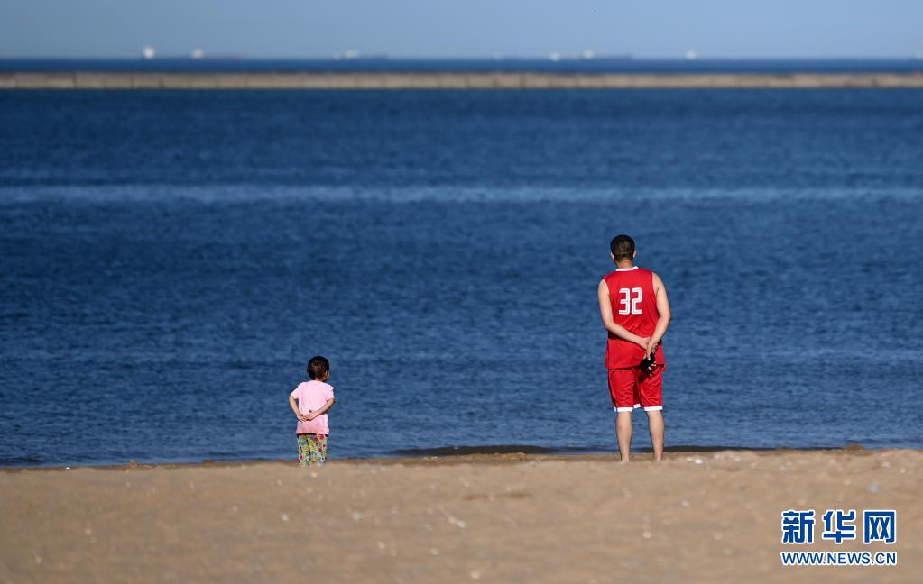 在天津市滨海新区东疆港人工沙滩,家长和小朋友一起背手望向大海(6月5日摄)。新华社记者 李然 摄