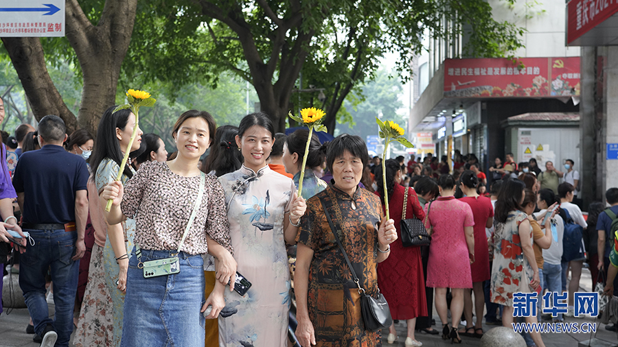 有家长带上向日葵为孩子送考,寓意在考试中能够“一举夺魁”。新华网 刘文静 摄