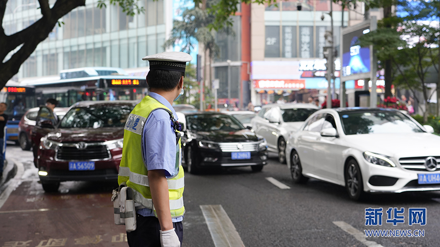 重庆一中考点外,交巡警正在维护交通秩序,为考生营造安静的环境。新华网 刘文静 摄