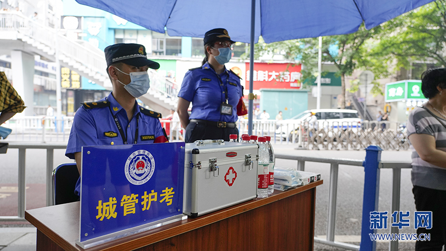 重庆南开中学考点外,重庆市城市管理部门设置了“城管护考”岗位,为高考考生提供口罩、文具、药品等应急用品。新华网 刘文静 摄