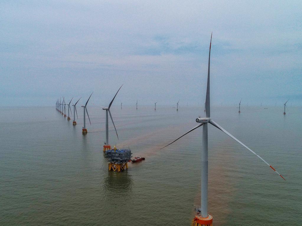 空中俯瞰浙江省最大海上风电场群的岱山4号海上风电场。(新华社记者 徐昱摄)