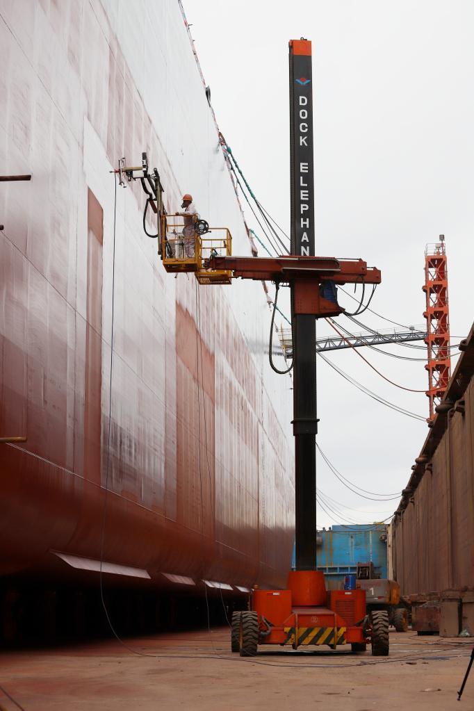 “例如‘船坞大象’,专门用于大面积除锈作业,而作业中的废水会被‘船坞蓝鲸’100%回收,处理后可再利用。”陈勇说。