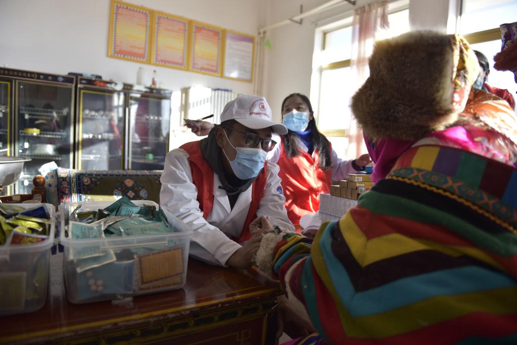 西藏尼玛县新时代文明实践中心志愿者在尼玛县五保集中供养服务中心进行义诊(2021年2月3日摄)。新华社记者 格桑朗杰 摄