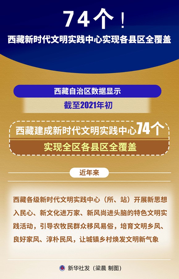 新华社拉萨6月7日电(记者张兆基、格桑朗杰)西藏自治区数据显示,截至2021年初,西藏建成新时代文明实践中心74个,实现全区各县区全覆盖。