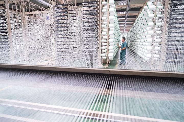 5月14日,工人在位于苏州吴江区的一个纺织智能车间内作业。(新华社记者李博摄)