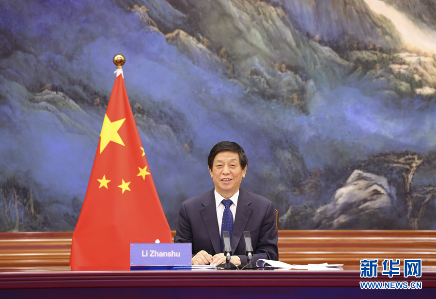 6月8日,全国人大常委会委员长栗战书在北京人民大会堂以视频方式同白俄罗斯国民会议共和国院主席科恰诺娃、代表院主席安德烈琴科举行会谈。新华社记者 黄敬文 摄