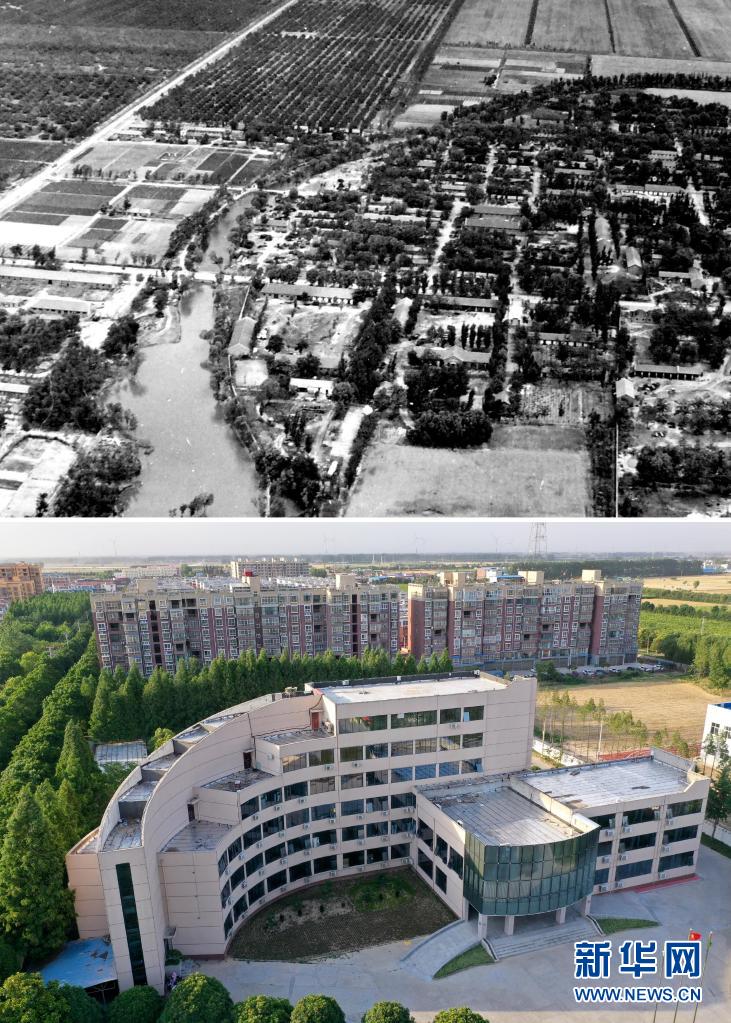 这是一张拼版照片。上图:20世纪70年代黄泛区农场场部(资料照片,新华社发);下图:2021年6月5日无人机拍摄的黄泛区农场场部(新华社记者李嘉南摄)。