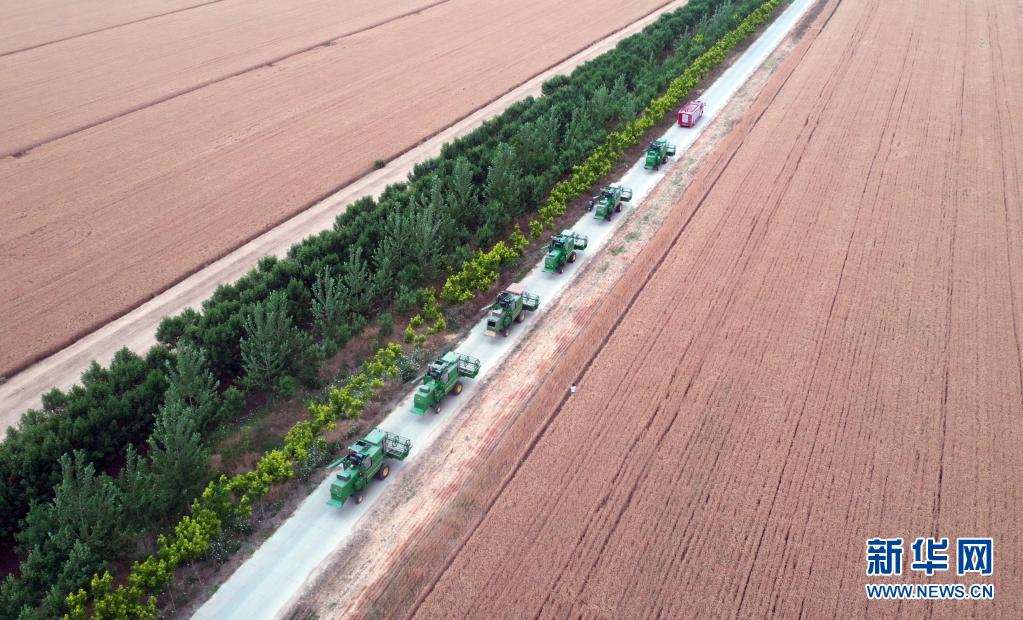 在河南省黄泛区农场九分场,农机队伍准备进入麦田作业(无人机照片,2020年6月2日摄)。