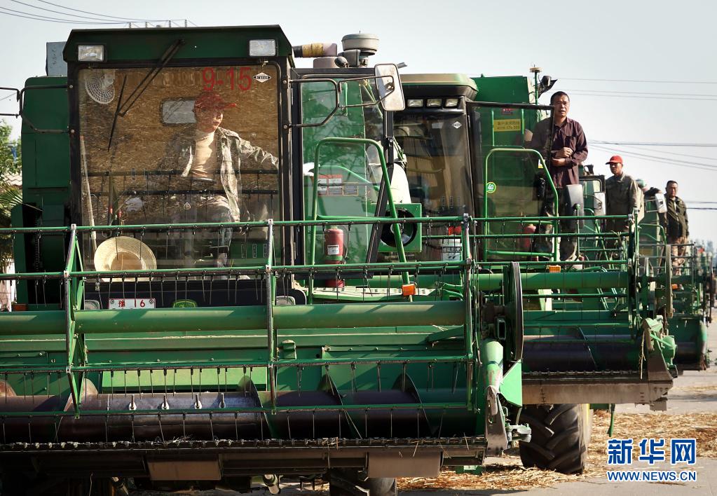 在河南省黄泛区农场九分场,农机队伍准备出发前往麦田进行收割作业(6月6日摄)。