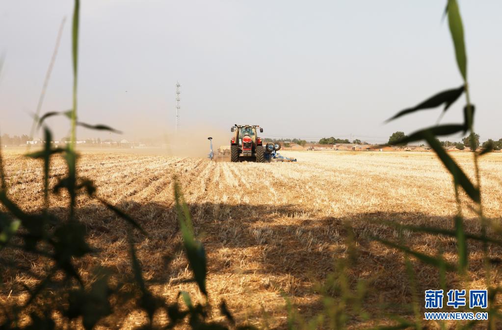 在河南省周口市黄泛区农场一分场的麦田里,农机手操作播种机播种玉米(6月5日摄)。