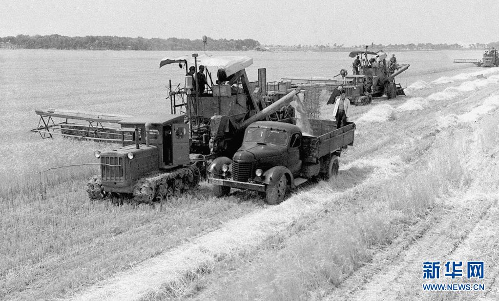 1962年,河南省黄泛区农场的收割机在收小麦。