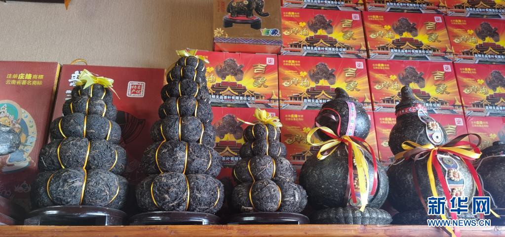 在位于西藏拉萨的一家茶叶公司的门店内摆放着造型独特的茶叶制品(4月23日摄)。新华社记者 张京品 摄