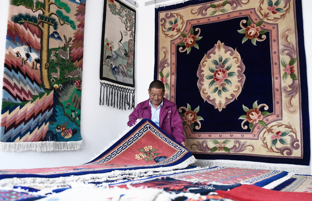 6月5日,在青海省西宁市湟中区上新庄镇加牙村,杨永良在整理制作好的藏毯。新华社记者 张龙 摄