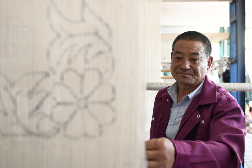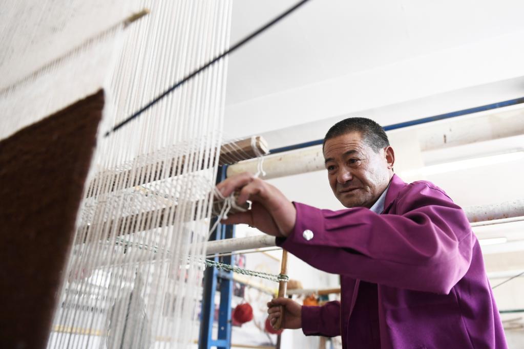 在青海省西宁市湟中区上新庄镇加牙村,藏毯手工艺人杨永良坐在一台织机前,五颜六色的毛线穿梭在编织杆间,重叠打扣后,慢慢延展成花色精美的藏毯。