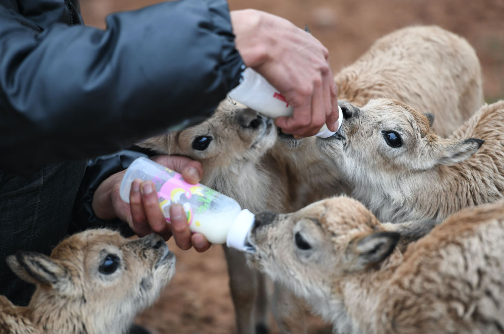 2020年7月7日,三江源国家公园管理局长江源园区可可西里管理处卓乃湖保护站工作人员给藏羚羊幼仔喂奶。