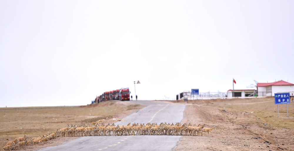 2016年6月7日,在青海可可西里,一群雌性待产藏羚羊正在通过青藏公路。