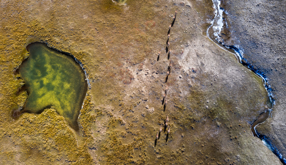 2019年10月19日,藏野驴在三江源地区活动(无人机照片)。